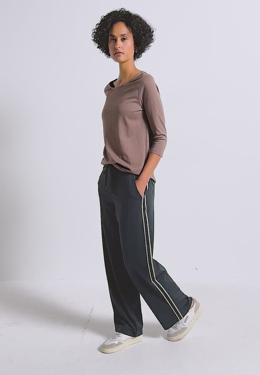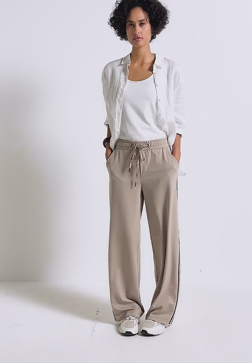 Street One wide leg trouser combine sporty piping with a relaxed, loose fit. A high waist, wide legs, and an elastic waistband with drawstring ensure a comfortable fit and a modern look. The twill jersey fabric with stretch offers pleasant comfort, ideal for stylish everyday looks.