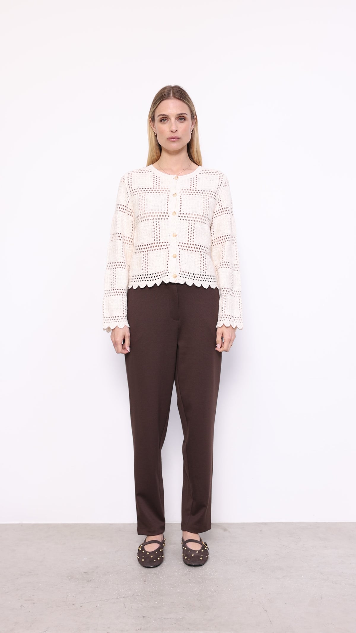 Soyaconcept crochet cardigan features a round neckline, a button closure, crochet texture, and scalloped edges. Pair it with jeans or a skirt for a simple and stylish look.