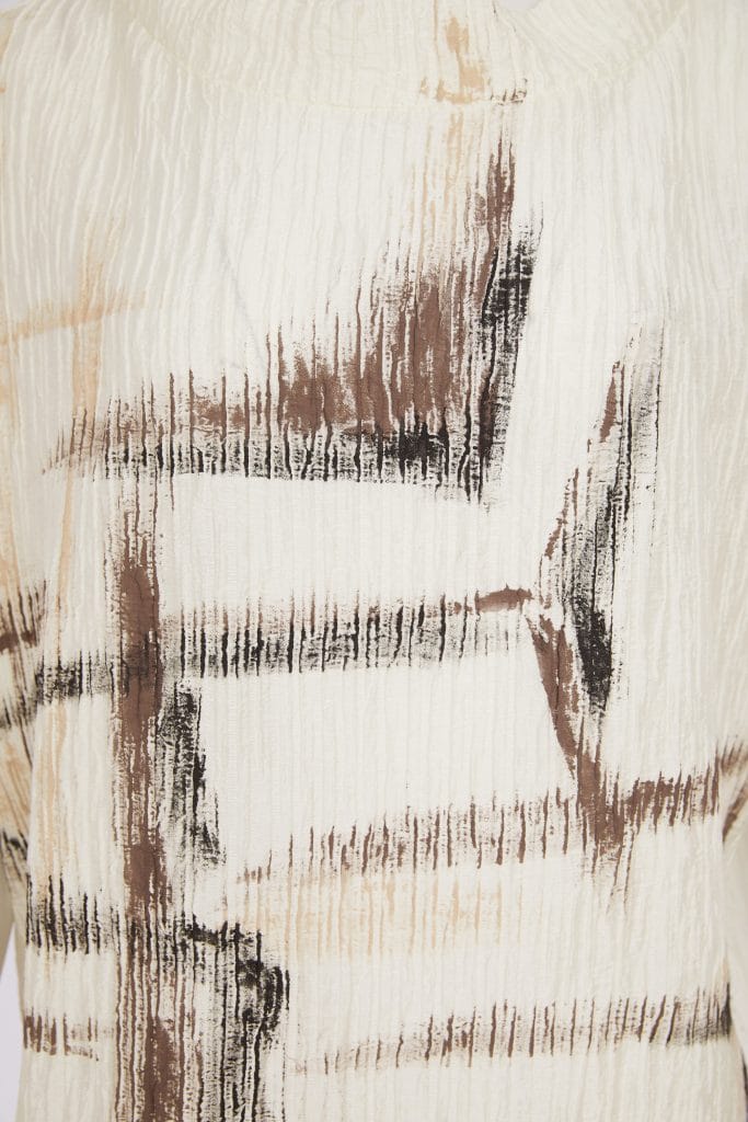 Texture and tone are two elements that NAYA excel at. This square shaped crinkle top with a soft funnel neck is a beautiful example. The fabric is ultra soft and textured which is then overlaid with a soft blurred paint print. To complete the look a contrast hem ties it all together. Plain short sleeves are a must.