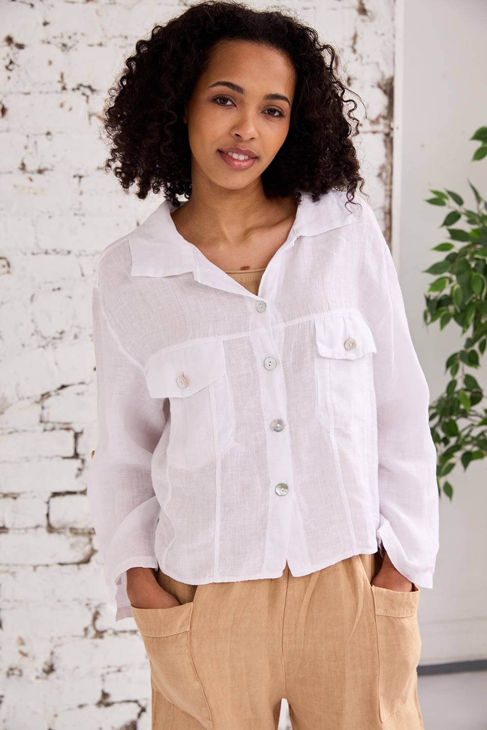 The ART linen den style jacket features button up detailing, adjustable sleeve length, a collar neckline and two front pockets, pair it with the matching linen trousers for a cohesive outfit.