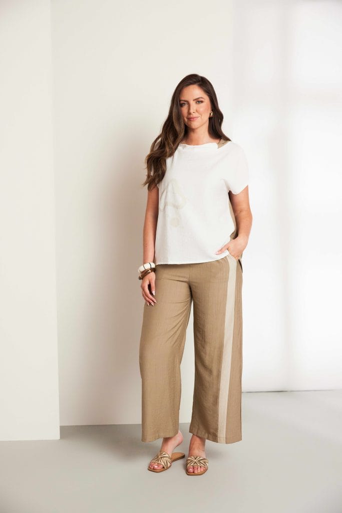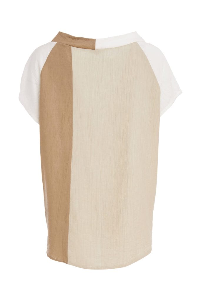 As funnel neck tops continue to grow in popularity ORA introduce their version and it is full of detail. The front bodice displays a light abstract pebble print while the back is layered in two well spaced tonal stripes. The stripes have been added to boost the neck line while the sleeves remain plain.