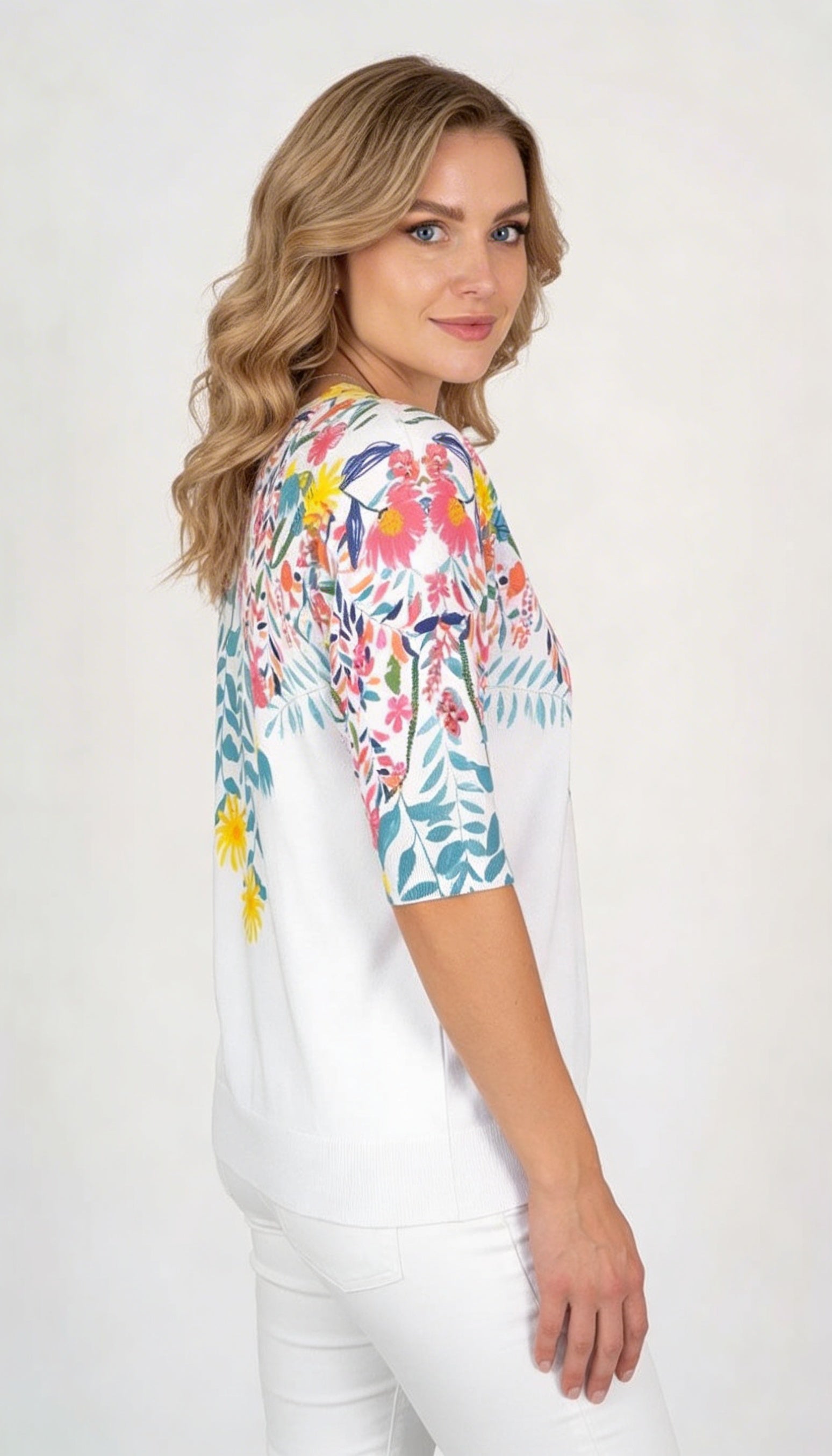 The Kartner border knit features a spring inspired floral pattern in an array of colours, with a round neck and half length sleeves, its the perfect piece to pair with any denim.