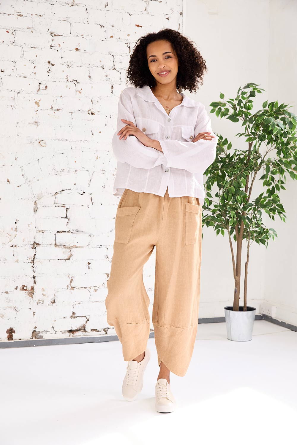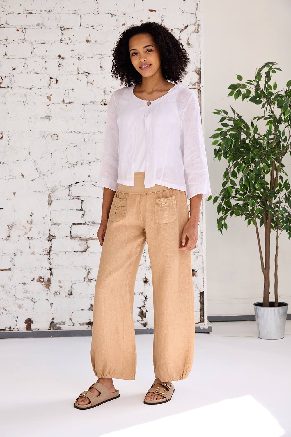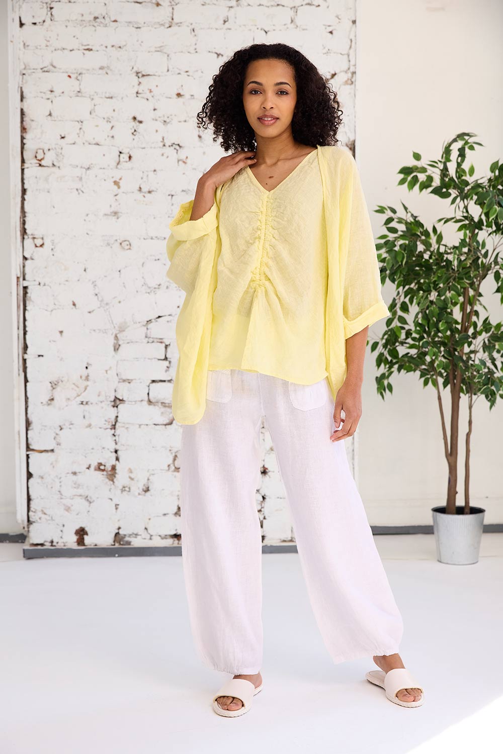 The ART ruched eng trouser features two-pocket detailing on the trouser front, a comfortable and elasticated waistband, long straight leg fit that is ruched at the bottom. These bottoms are the perfect linen trouser for the summer months ahead.
