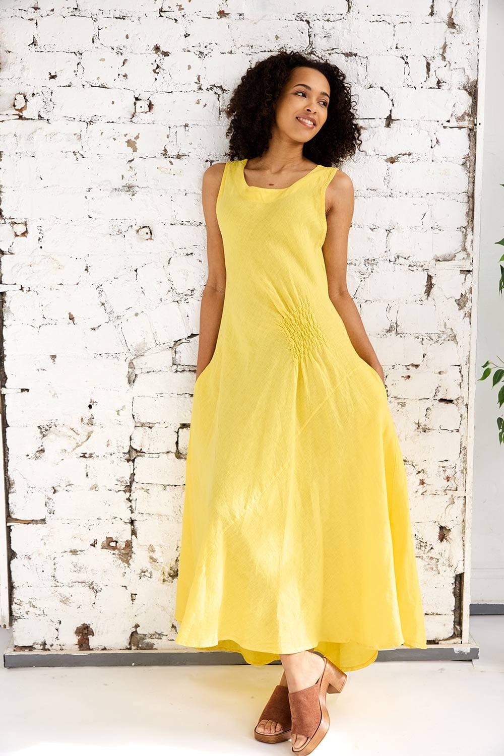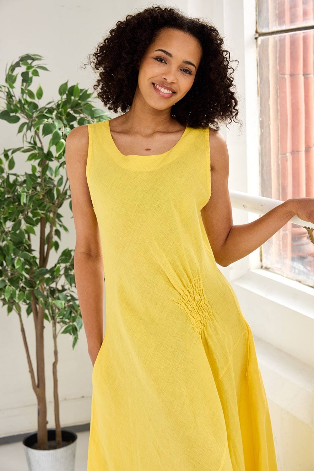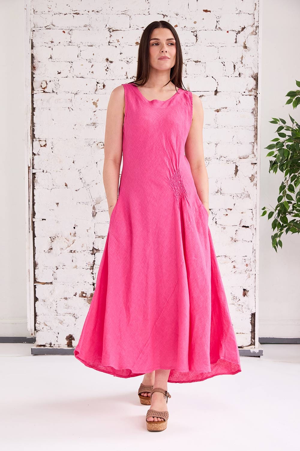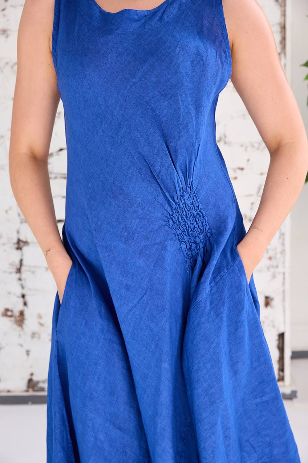 The ART side ruche swing dress is a colourful maxi dress for the summer season ahead, with a sleeveless look, flattering round neckline, maxi length, ruched side detailing and pockets, its a beautiful and functional dress for summer.
