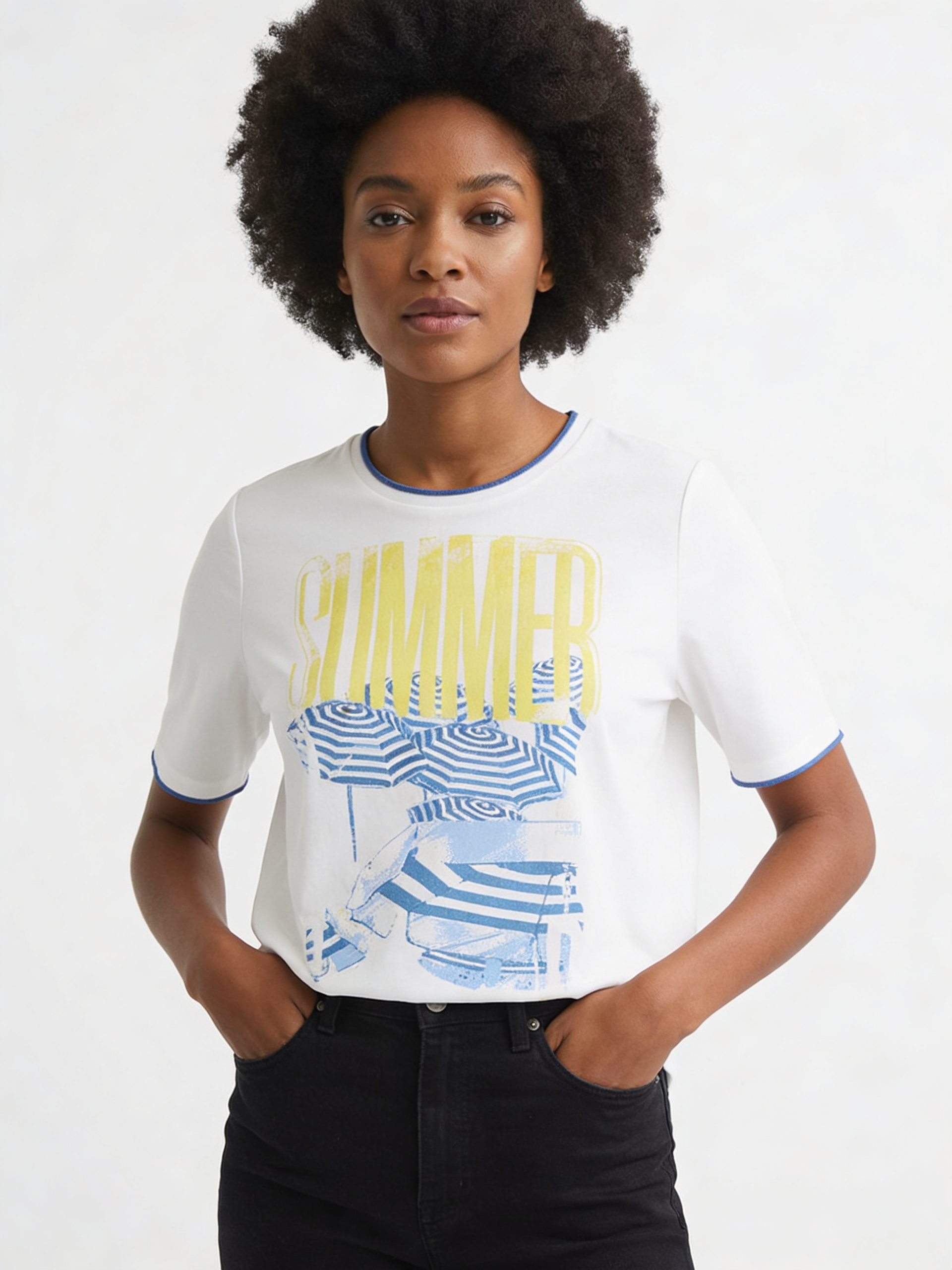 Introducing your new go-to white tee, with its contrast trim, round neck, and funky umbrella parasol print, its the perfect piece to elevate your everyday outfit.