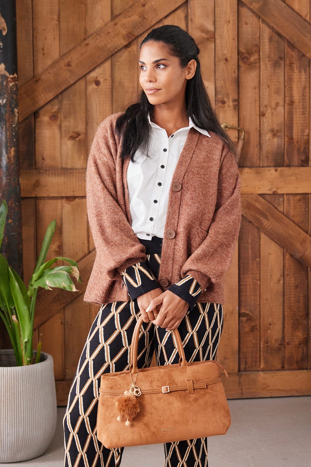 The Cadhla bag features a rich warm brown suede finish and comes with a detachable keychain that easily clips on, adding both style and practicality.