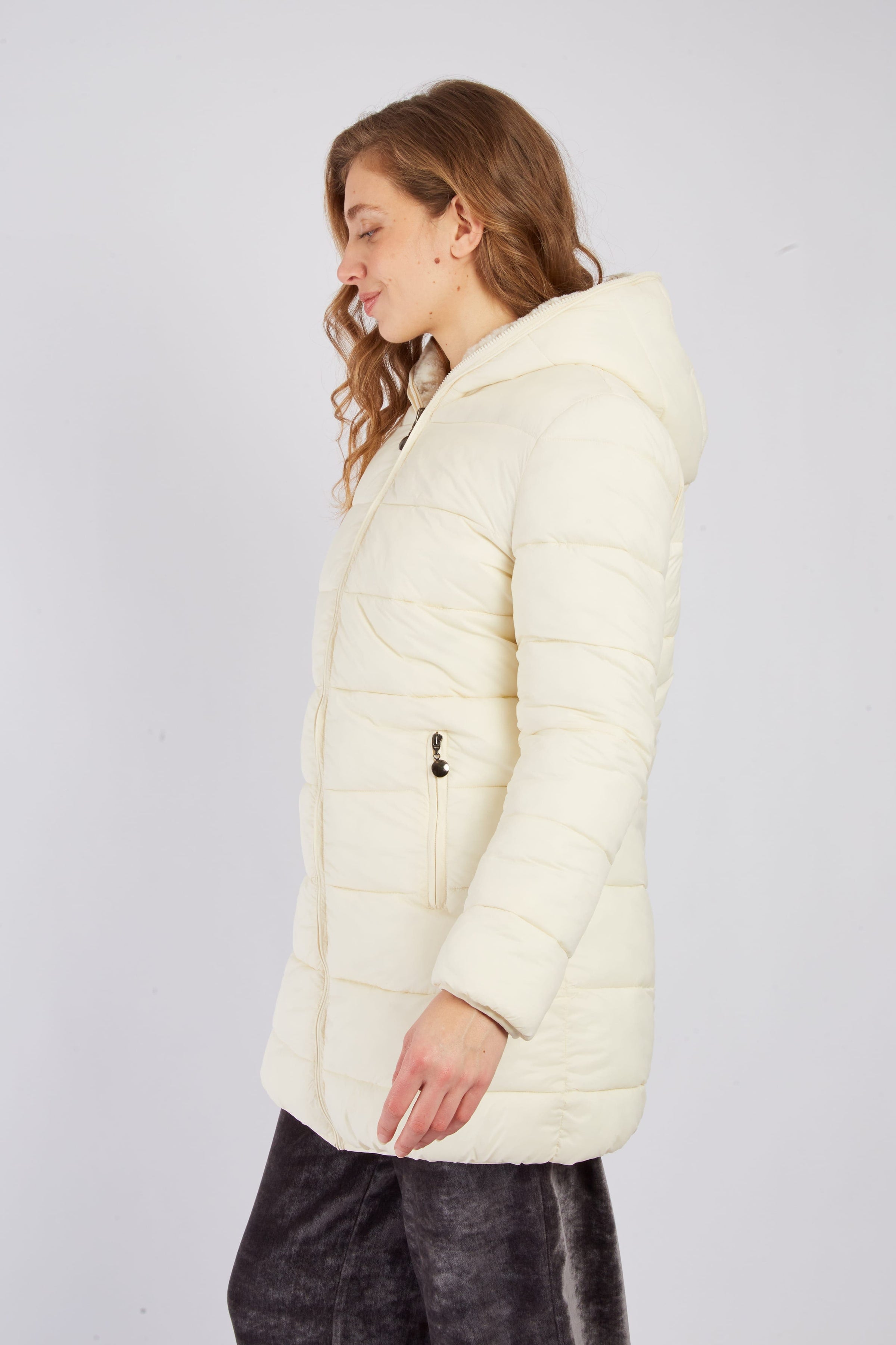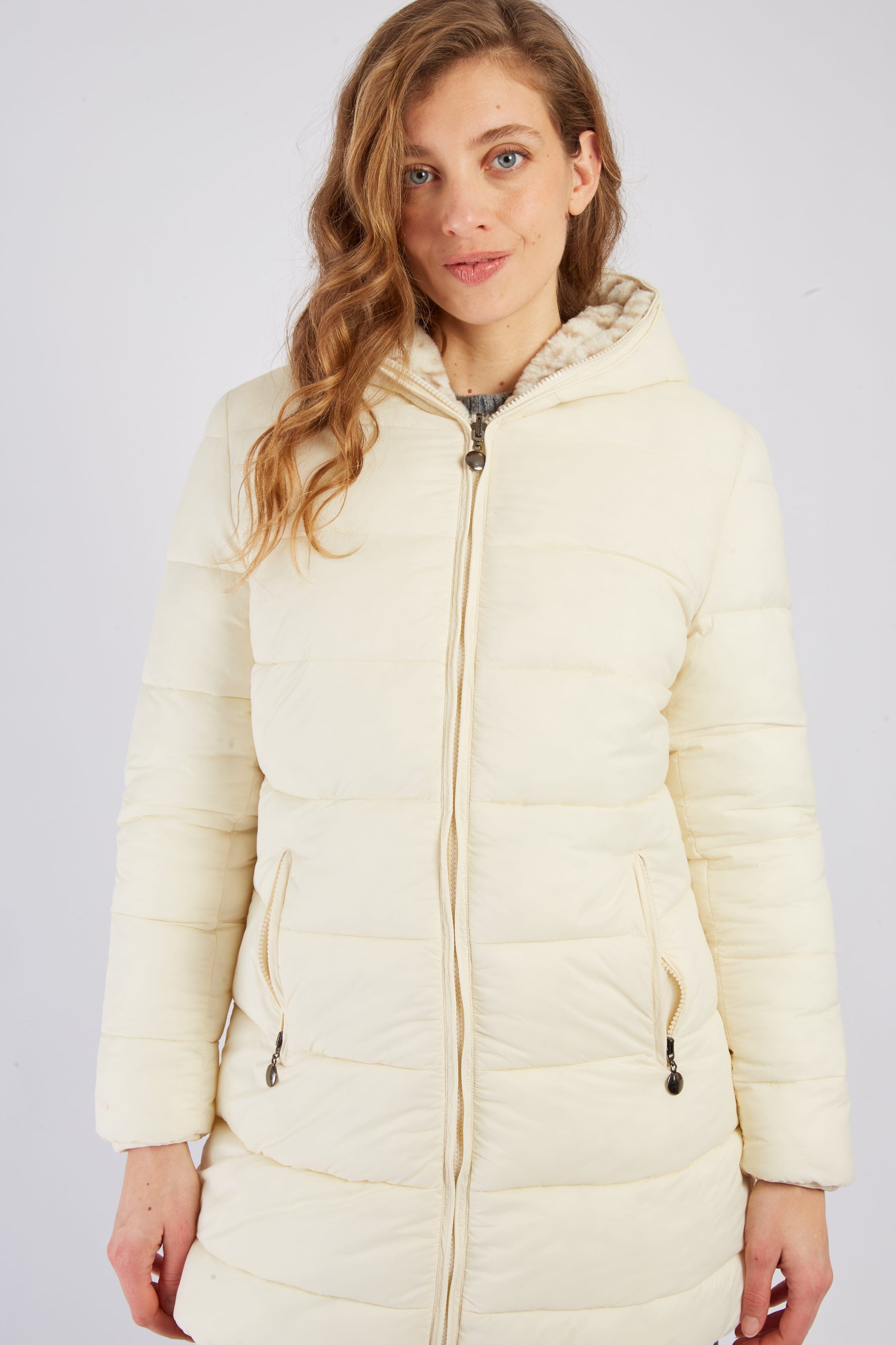 Derhy reversible animal print coat offers versatile style with its quilted puffa silhouette on one side and cozy animal print fleece on the other, combining warmth and comfort.