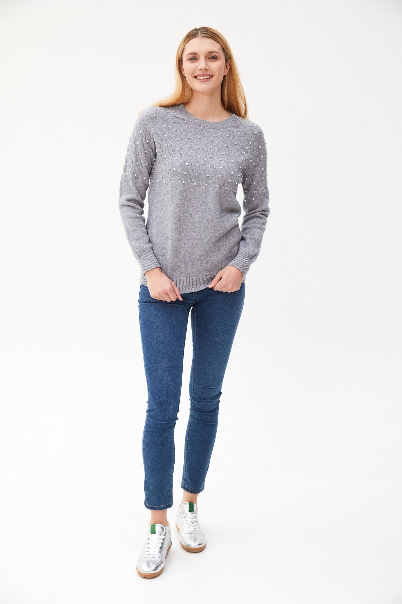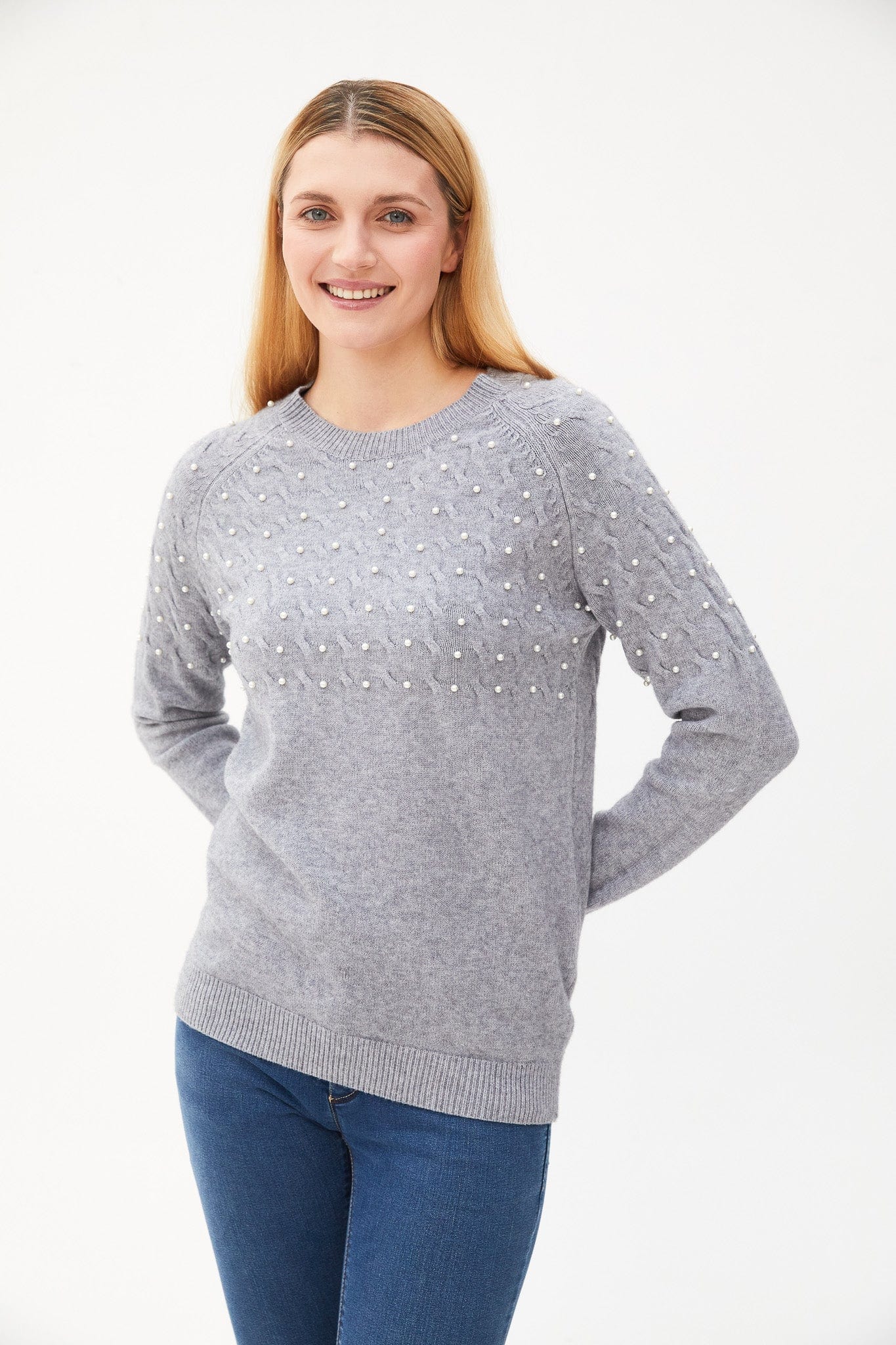 Kartner pearl sweater combines timeless style with comfort, featuring a beautifully mixed cable knit design that adds texture and depth to your look. Its classic round neck offers a flattering fit, perfect for layering or wearing on its own.