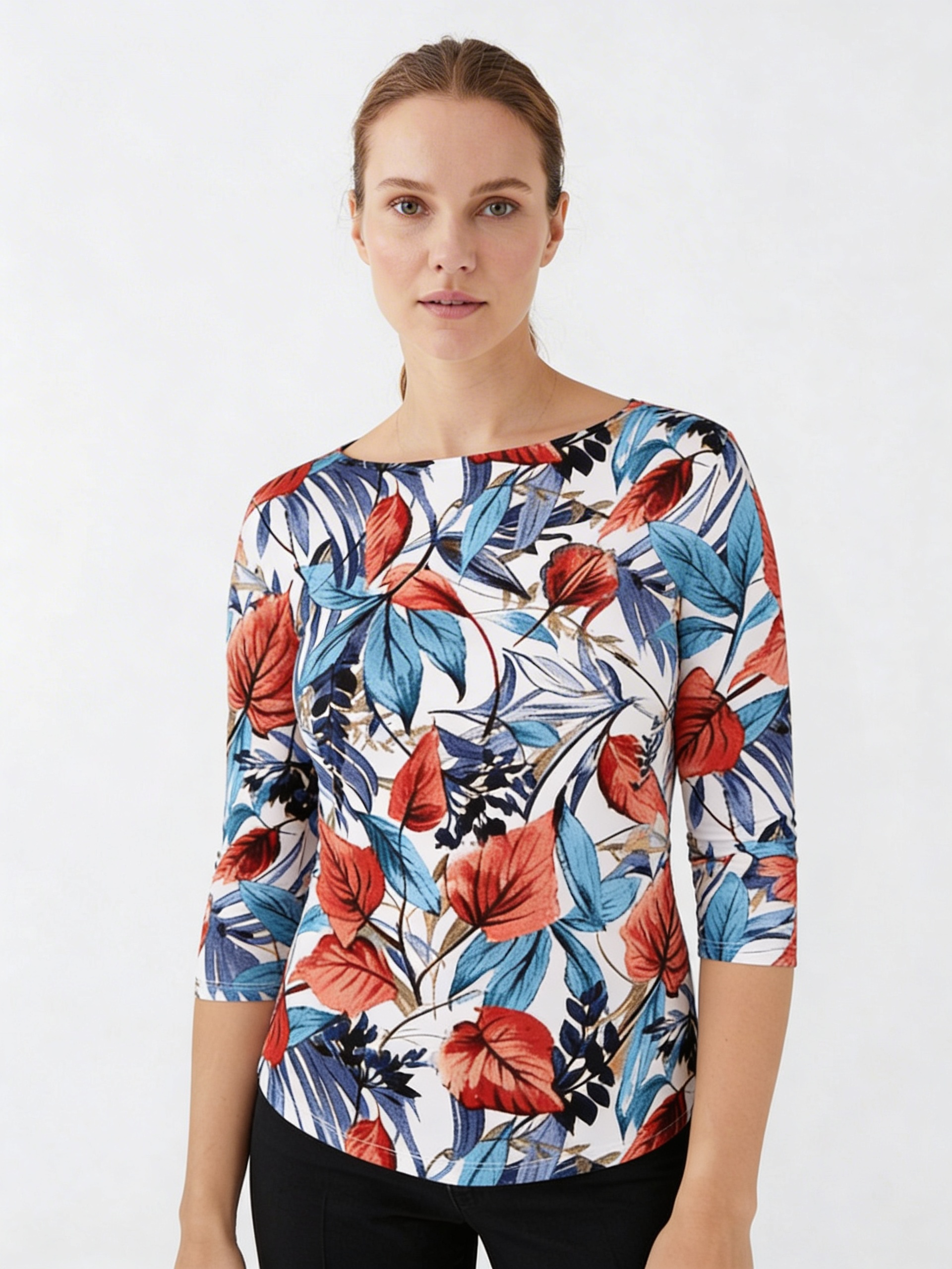 The Kartner tropical t-shirt embodies the summer season, with its all over funky tropical print in beautiful red and blue, as well as its straight neck and three-quarter length sleeves, its the perfect piece to wear with any denim this season.