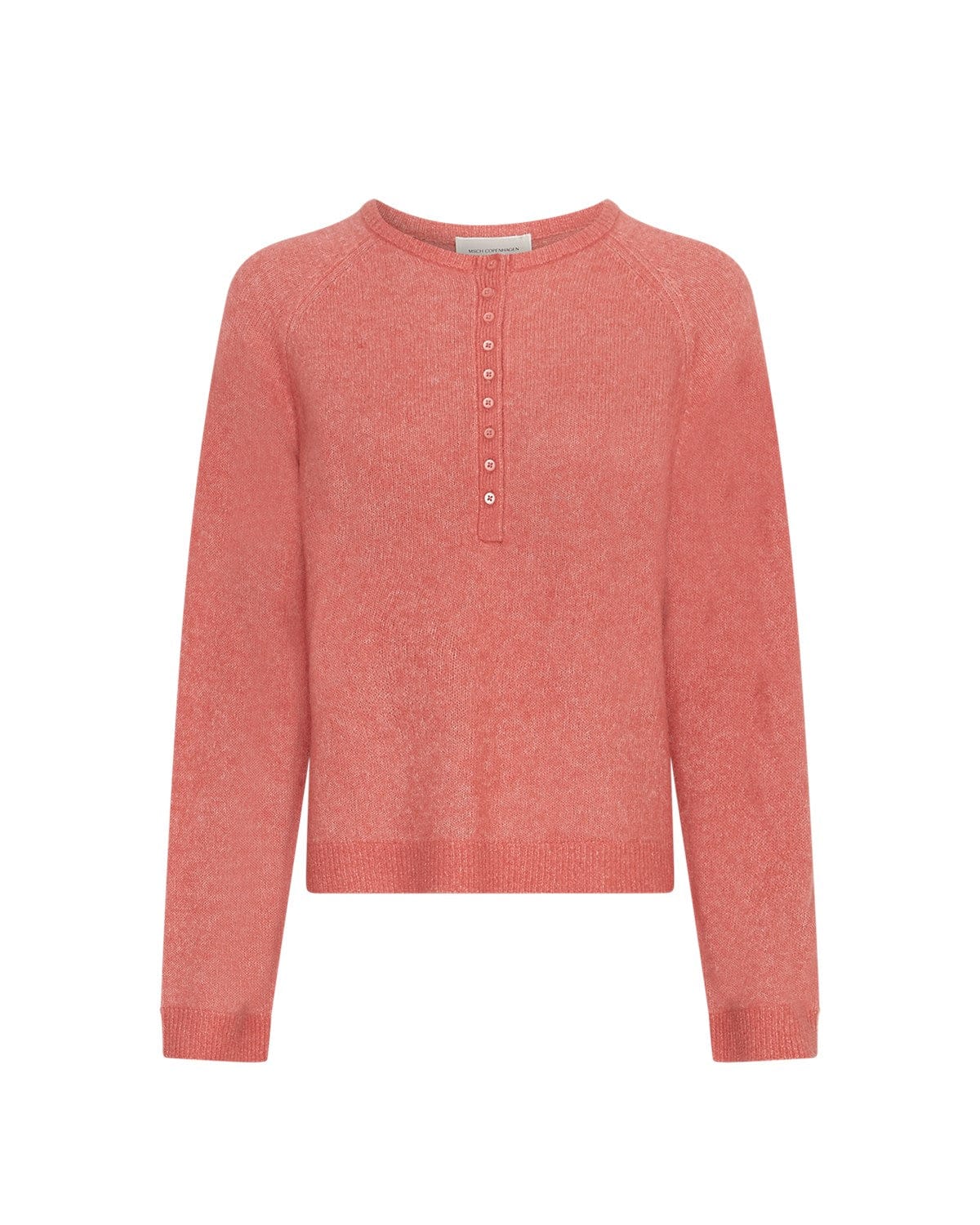 The MSCH alpaca blend knit features a flattering half button up detail, with a high round neck, long sleeves and a beautiful burnt orange colour, this knit is the perfect transitional piece to incorporate colour into the spring months ahead.
