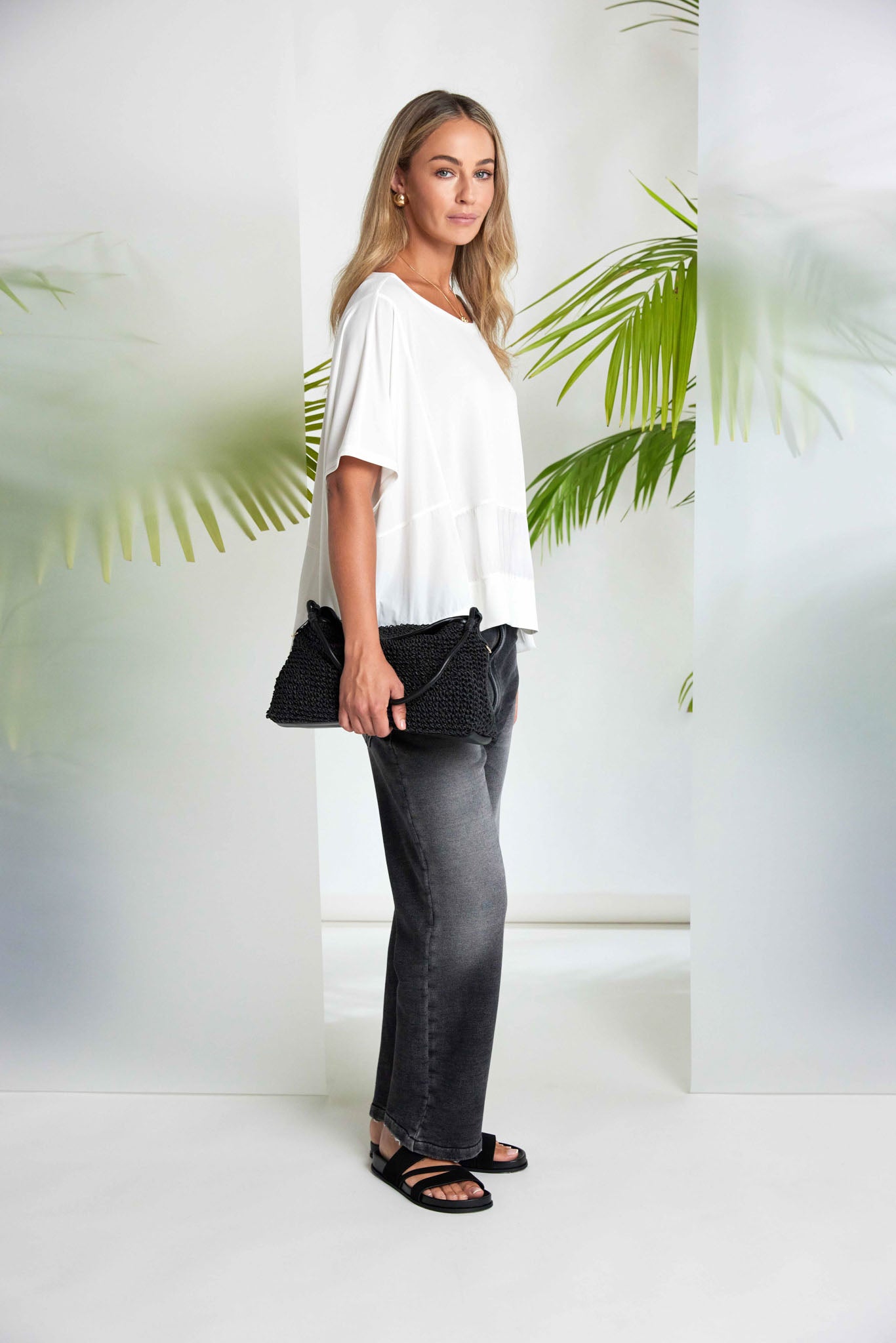 This NAYA box trim top is elegance personified. The fabric is soft and silky, allowing it to float down the body. Complete with a boat neckline, short sleeves, and dipping hem, the point of interest is a softly infused contrast fabric stretching from side seam to side seam on the bodice.