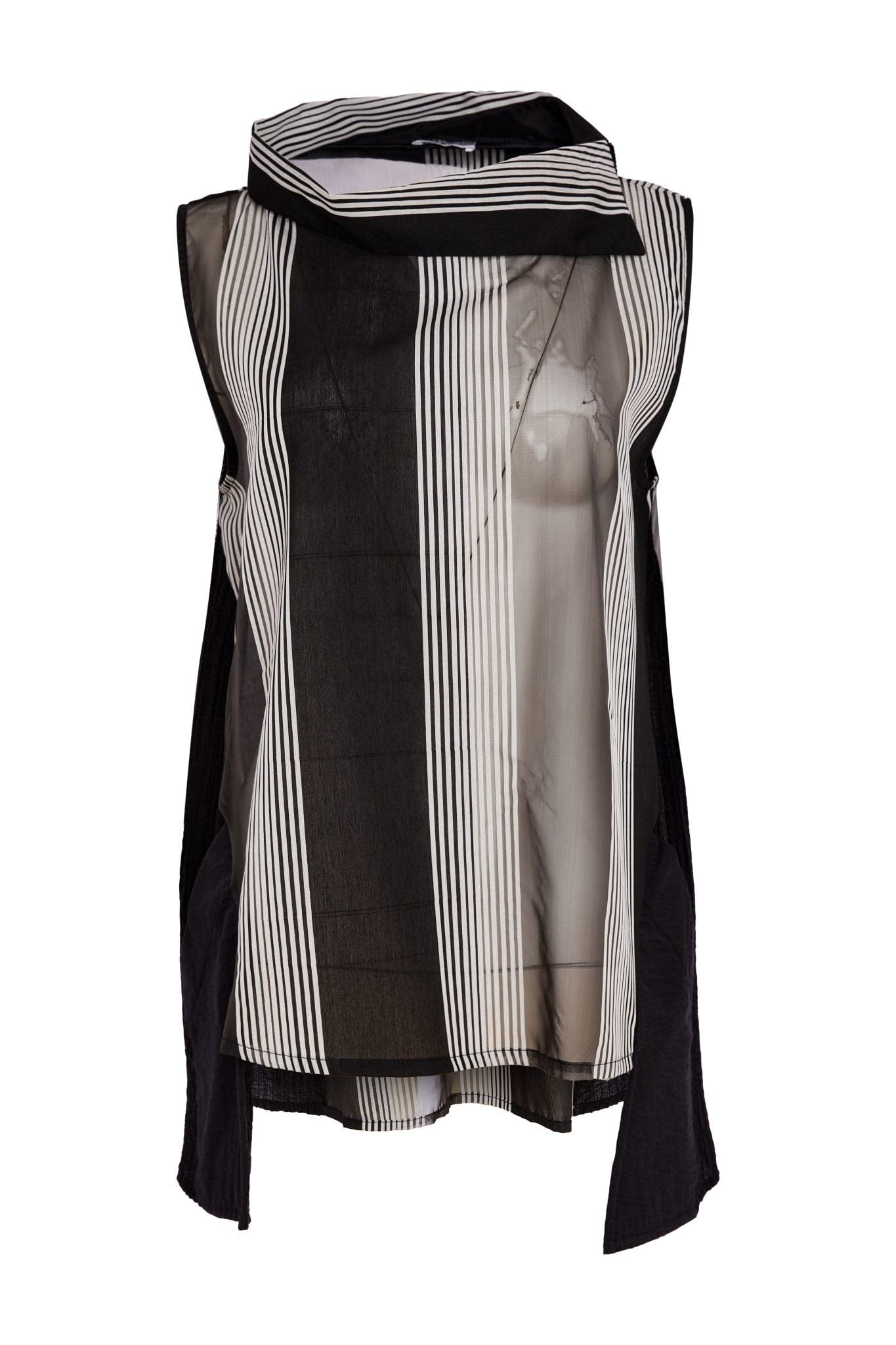 NAYA introduce a stunning long line sheer stripe top to the season. Featuring a wrap collar, this top excels thanks to the fine vertical pinstripe print and delicate sheer panel. The hemline dips just a little on each side adding to the mystery.
