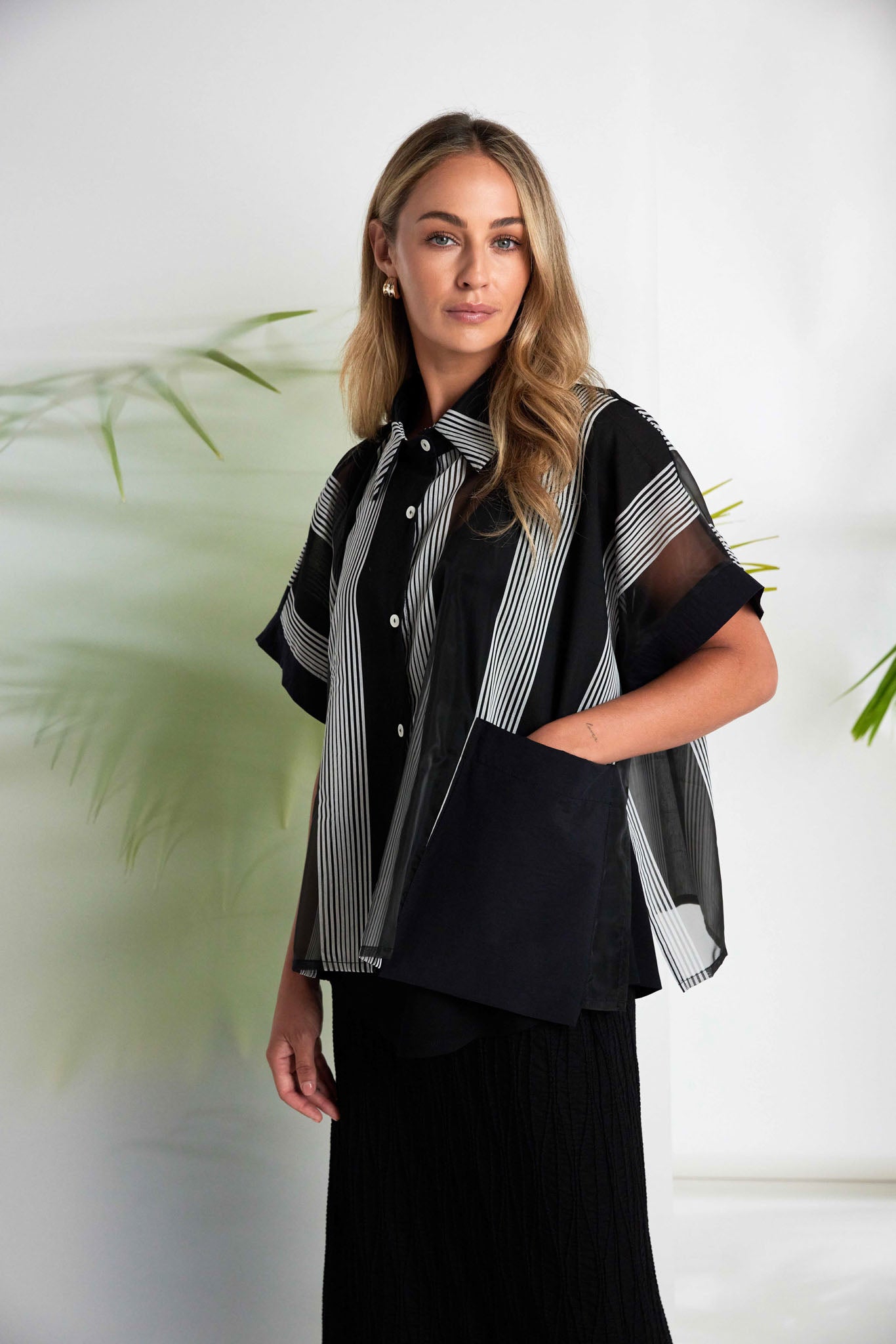 NAYA have created a comfort skirt with style. Featuring a pull up waistband, this piece falls to below the knee and finishes with a flourish thanks to the border hem in a very flattering black and white pinstripe print. You can wear it dressed up or down any day of the week.