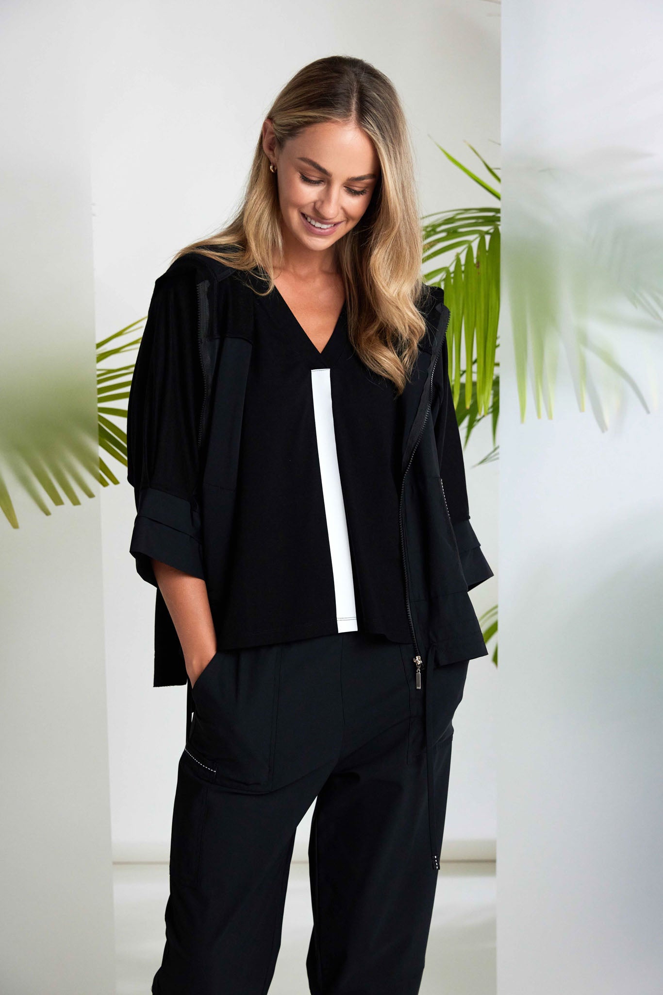 The NAYA stitch jacket top can be all you need as your last layer. This version with a hood, bracelet length sleeves and drawstring hem is your summer side kick. Finished with a contrast stitch to the slit pockets and hood it brings all the design kudos you need.