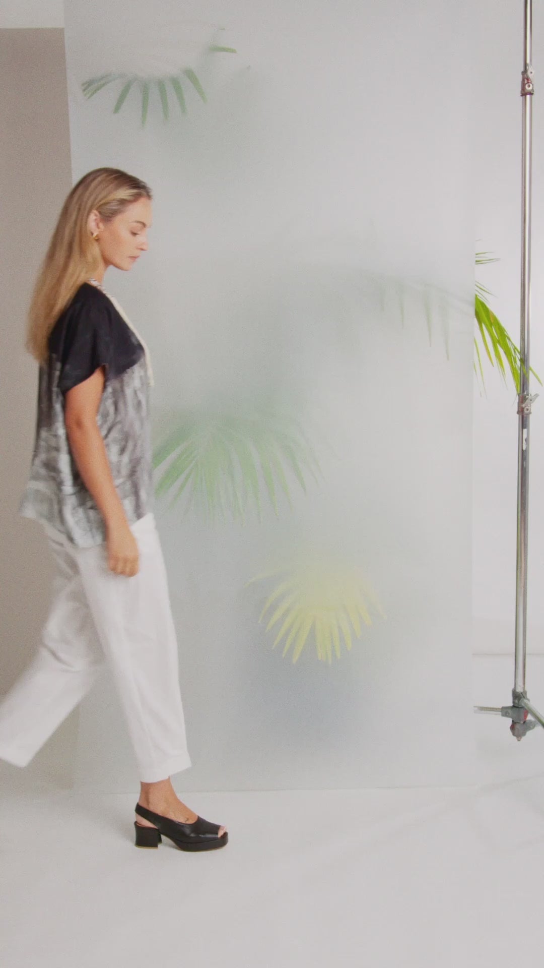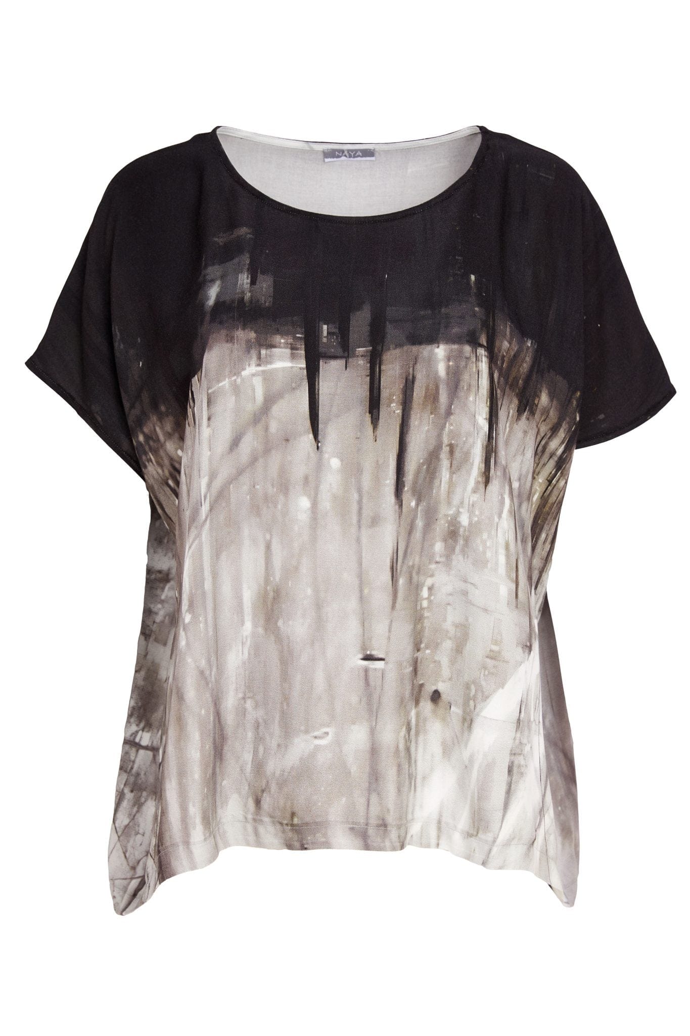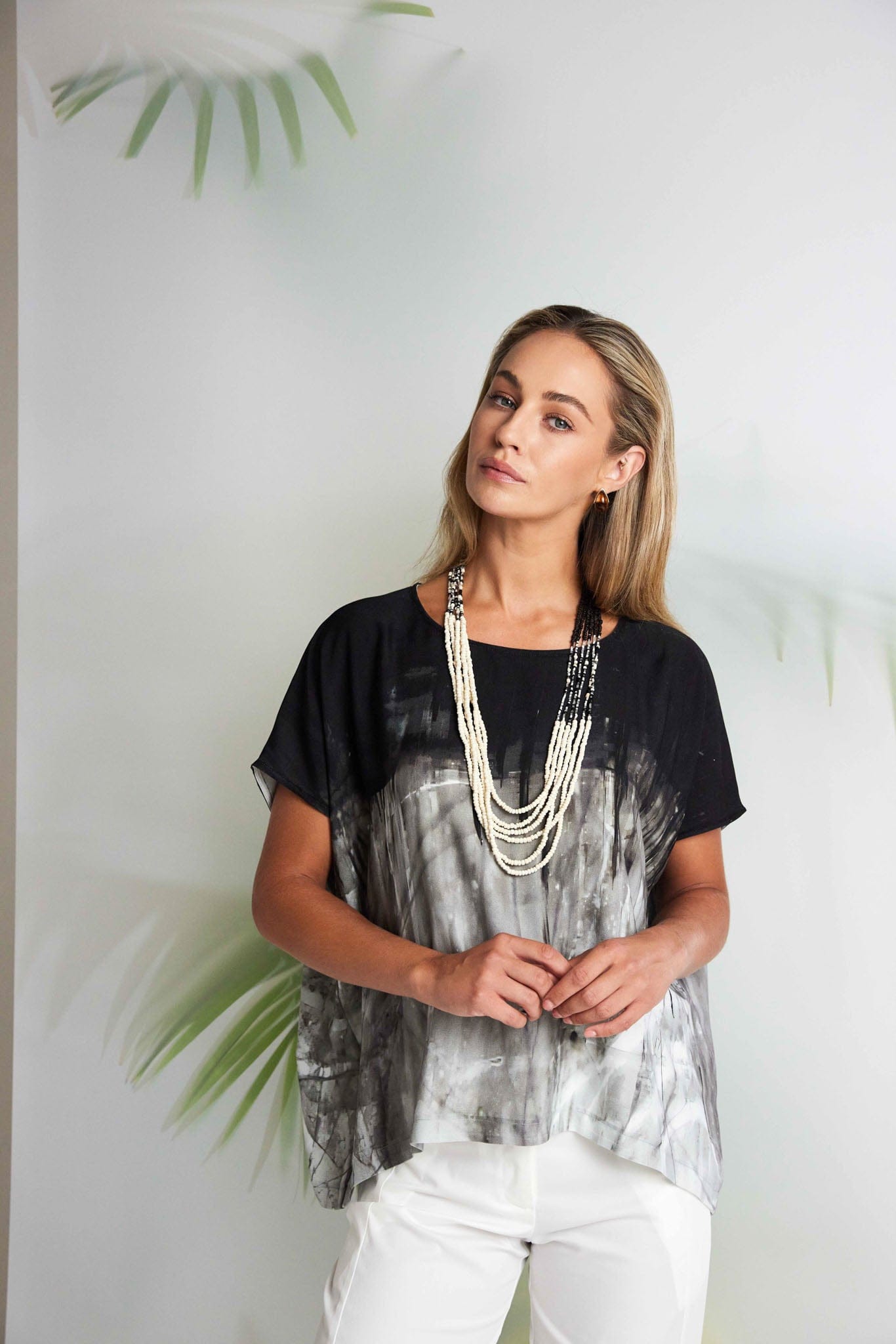 This NAYA stroke print top is a round neck, short sleeve top, and is mystical and intriguing at the same time thanks to a beautiful vertical print. Fading down the bodice from a strong shoulder line the print is reminiscent of an early morning summer mist.