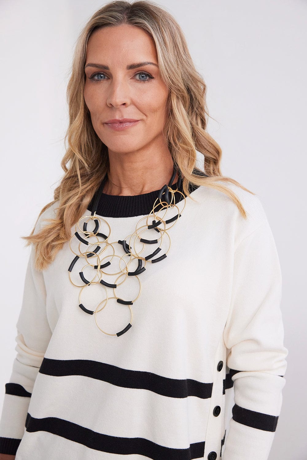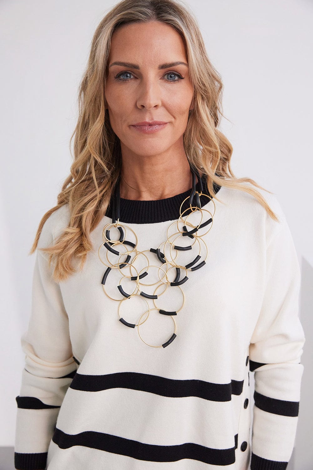 Make a bold impression this season with the Rowan necklace. Featuring striking gold circles and elegant black accents, this modern design effortlessly elevates any look.