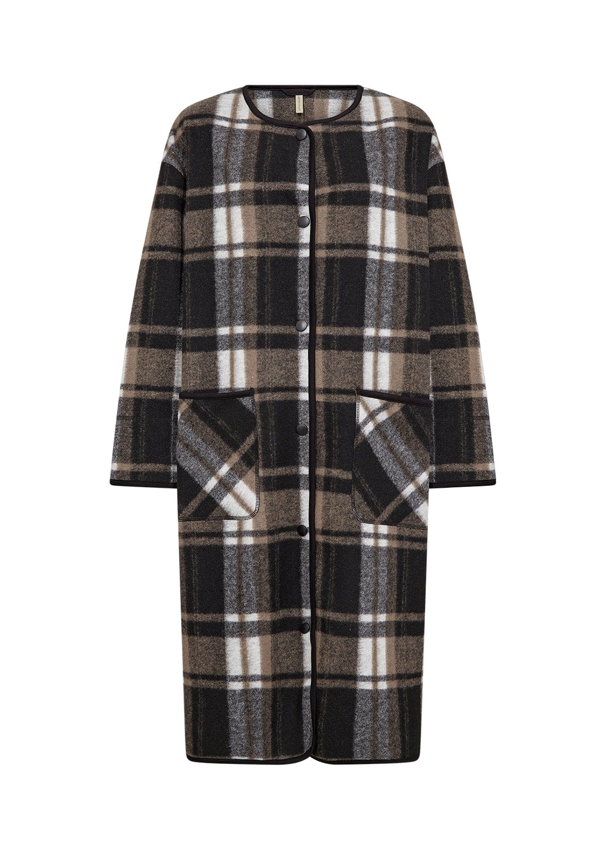 Soyaconcept check long coatigan edge to edge, double pocket features a round collar, button closure, and a long length with a plaid print with two front pockets. Wear it over casual outfits or pair with tailored trousers for a refined look.