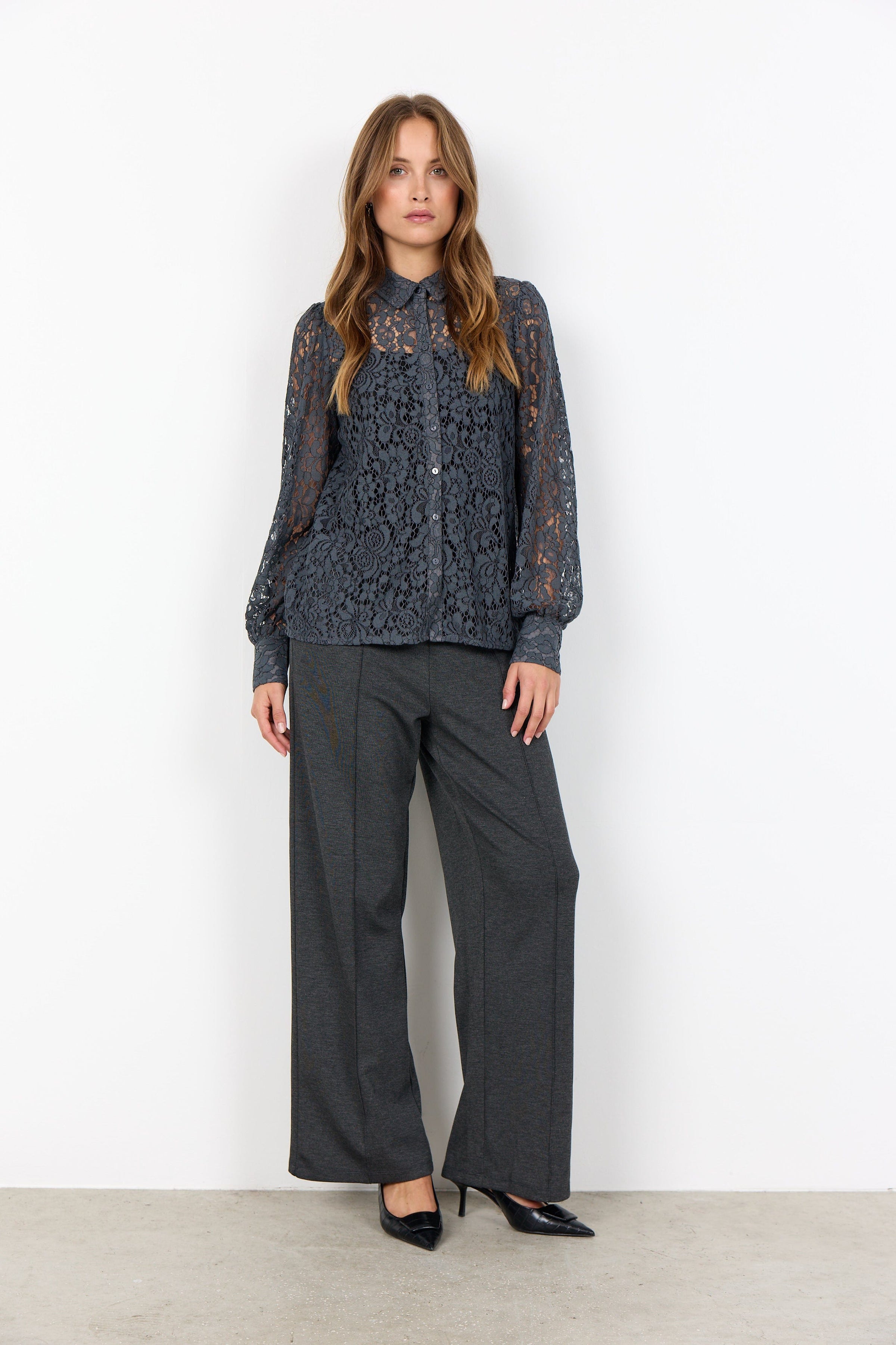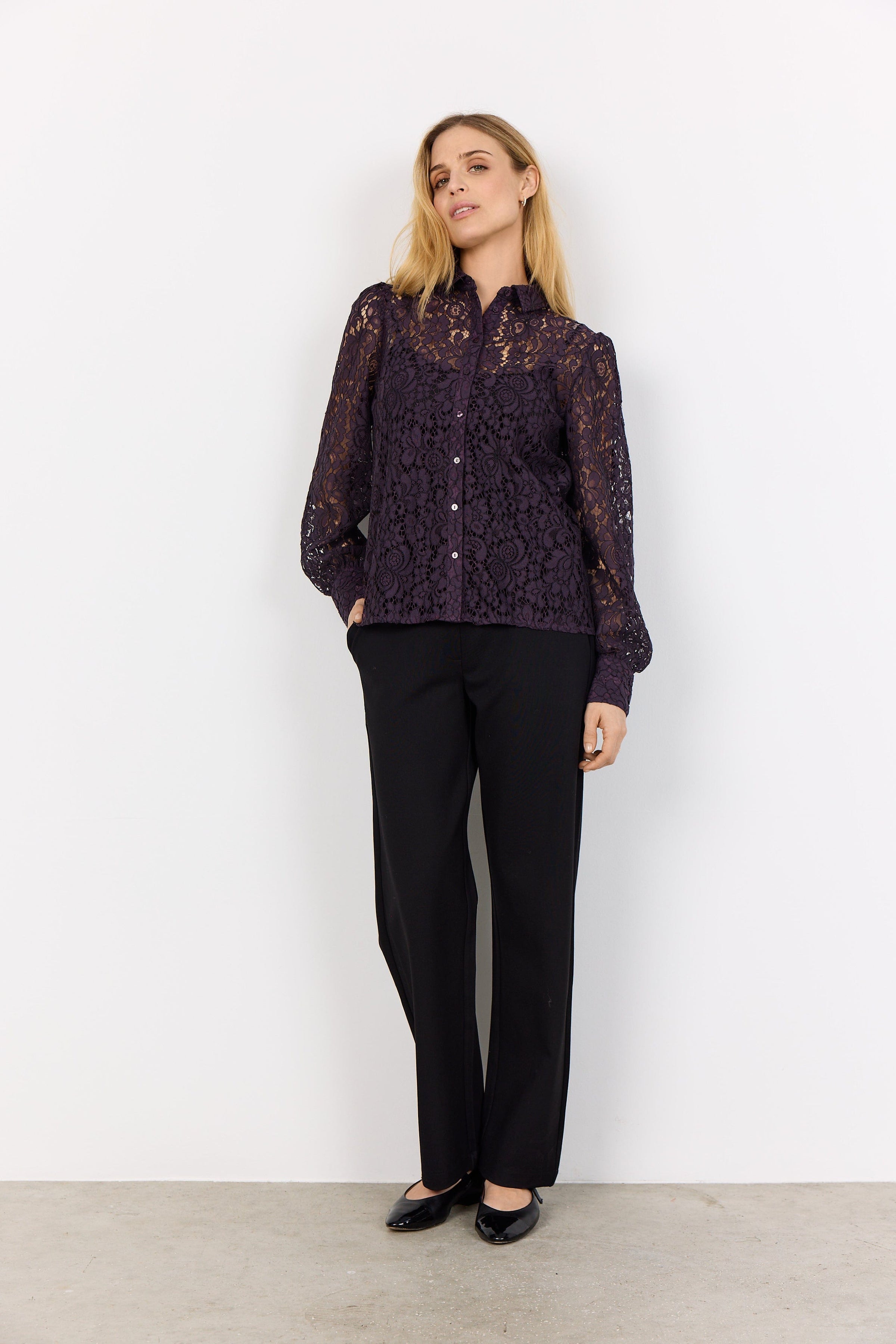 The Soyaconcept lace shirt features delicate full lace detailing and a striking peak collar. Its intricate design enhances any outfit, making it a sophisticated choice for work or a standout piece for evenings out.