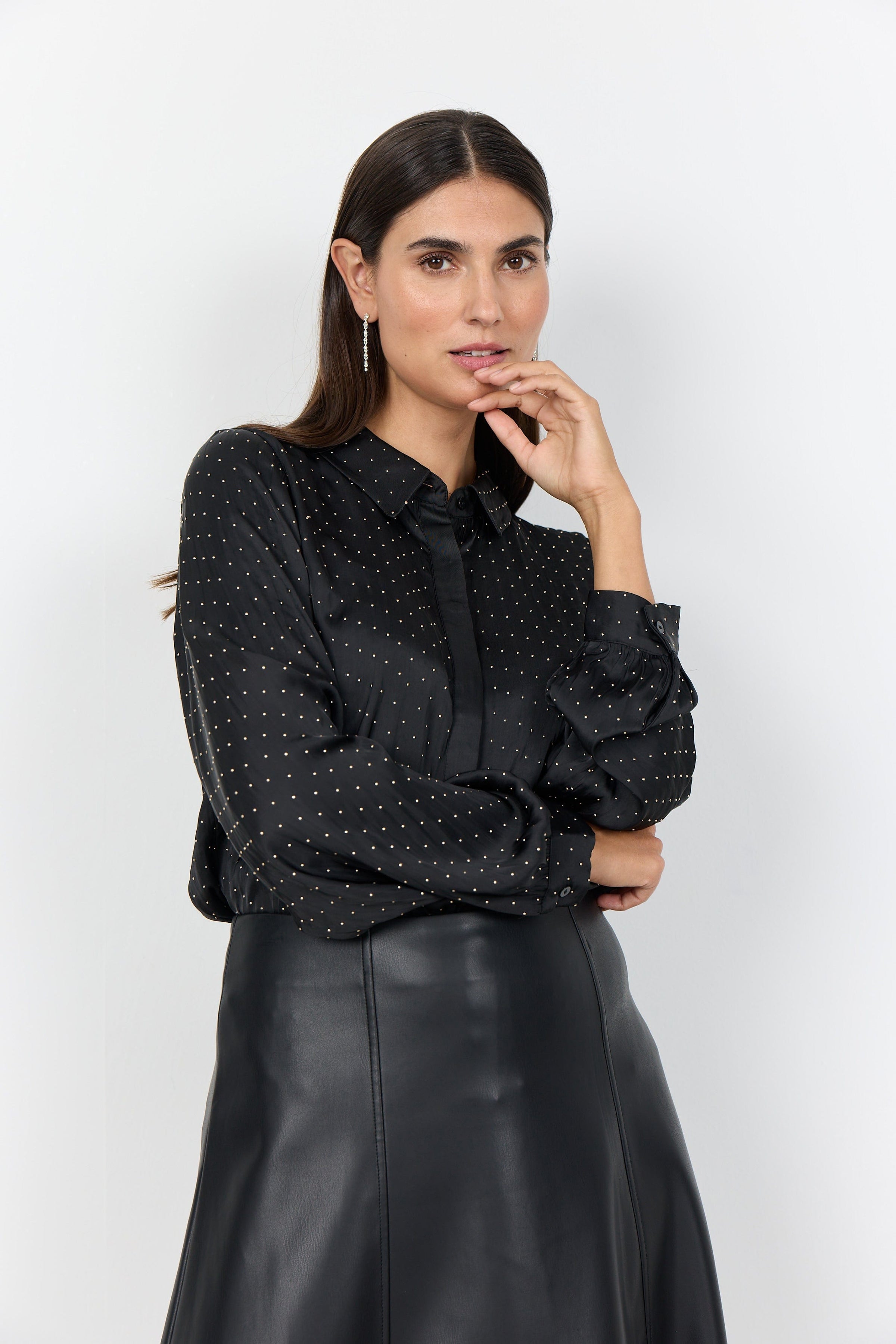 The Soyaconcept studden blouse features an all over stud detailing and buttons. The perfect piece to elevate your workwear or bring out your festive flair.