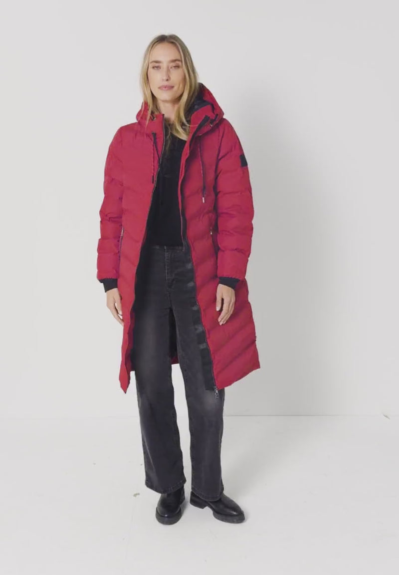 Street One long padded jacket combines technical performance with contemporary styling. The bonded seam construction provides superior weather resistance, while the drawstring hood allows customizable fit and coverage. The interior features a soft lining that enhances comfort during extended wear. Practical side zip pockets offer secure storage, and adjustable sleeve cuffs create an effective thermal seal. The sporty silhouette suits both casual and active pursuits, making this piece a versatile addition to any cold-weather wardrobe.