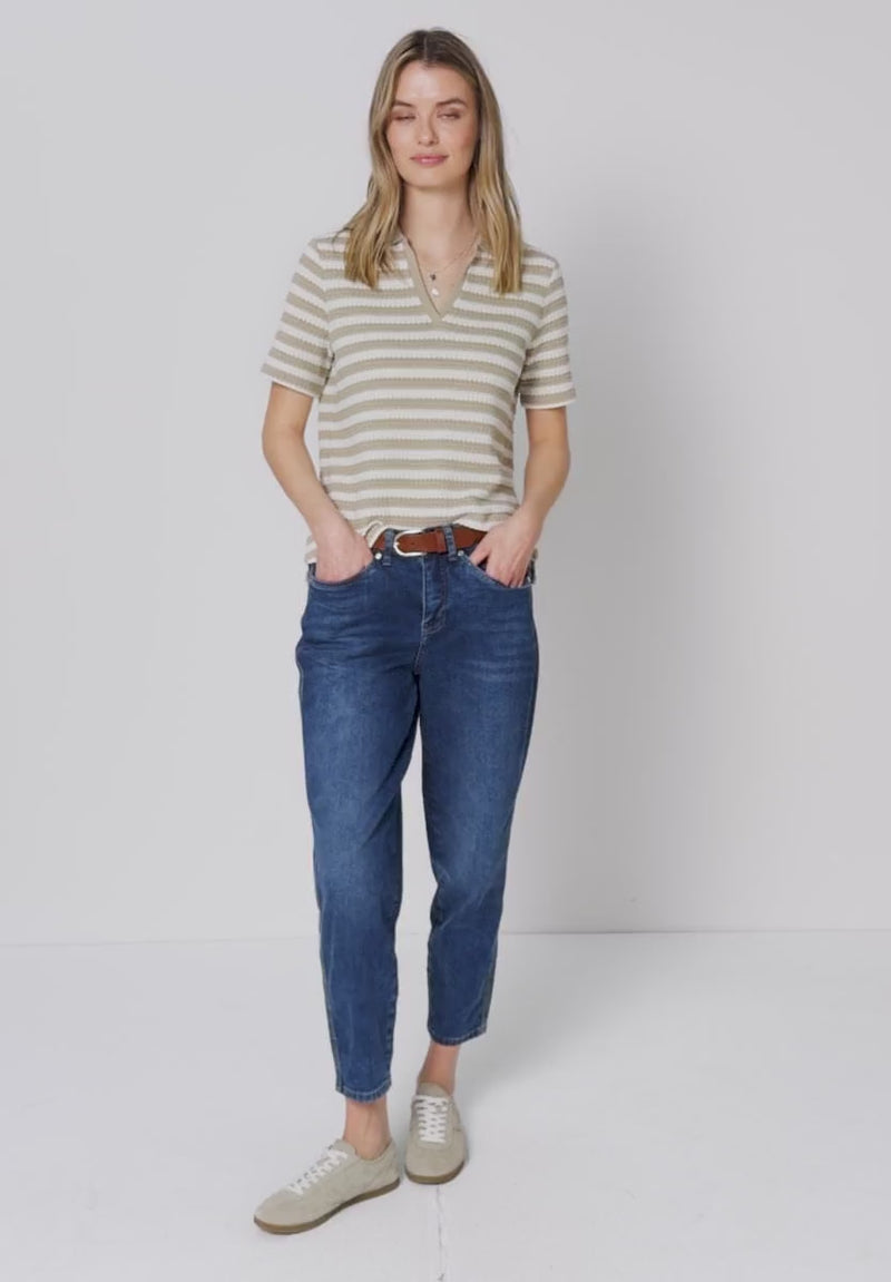 The Street One stripe knit top features a flattering v-neck neckline, a polo collar and short sleeves, this casual striped top is both comfortable and a wardrobe staple.