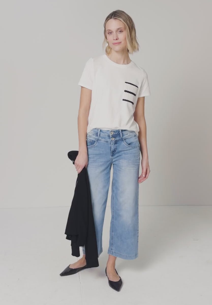 The Street One stripe pocket top is the perfect white cotton blend shirt, its casual and round neckline is flattering, with short sleeves and its striped pocket detailing.