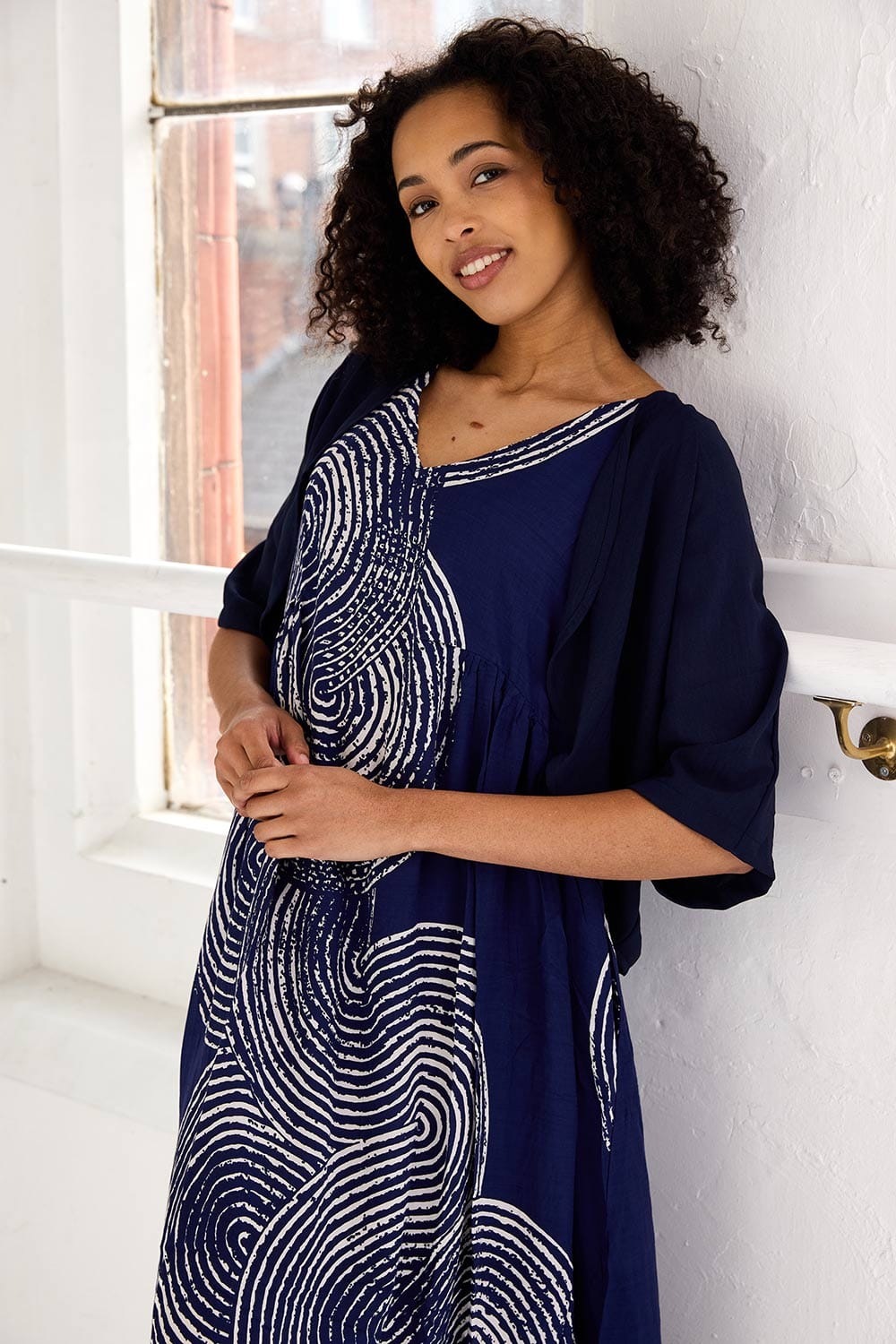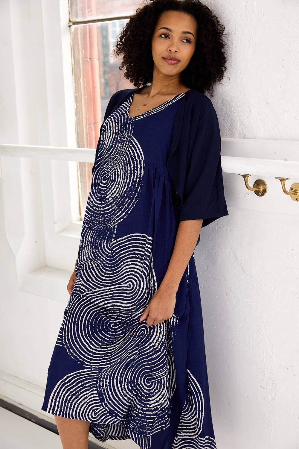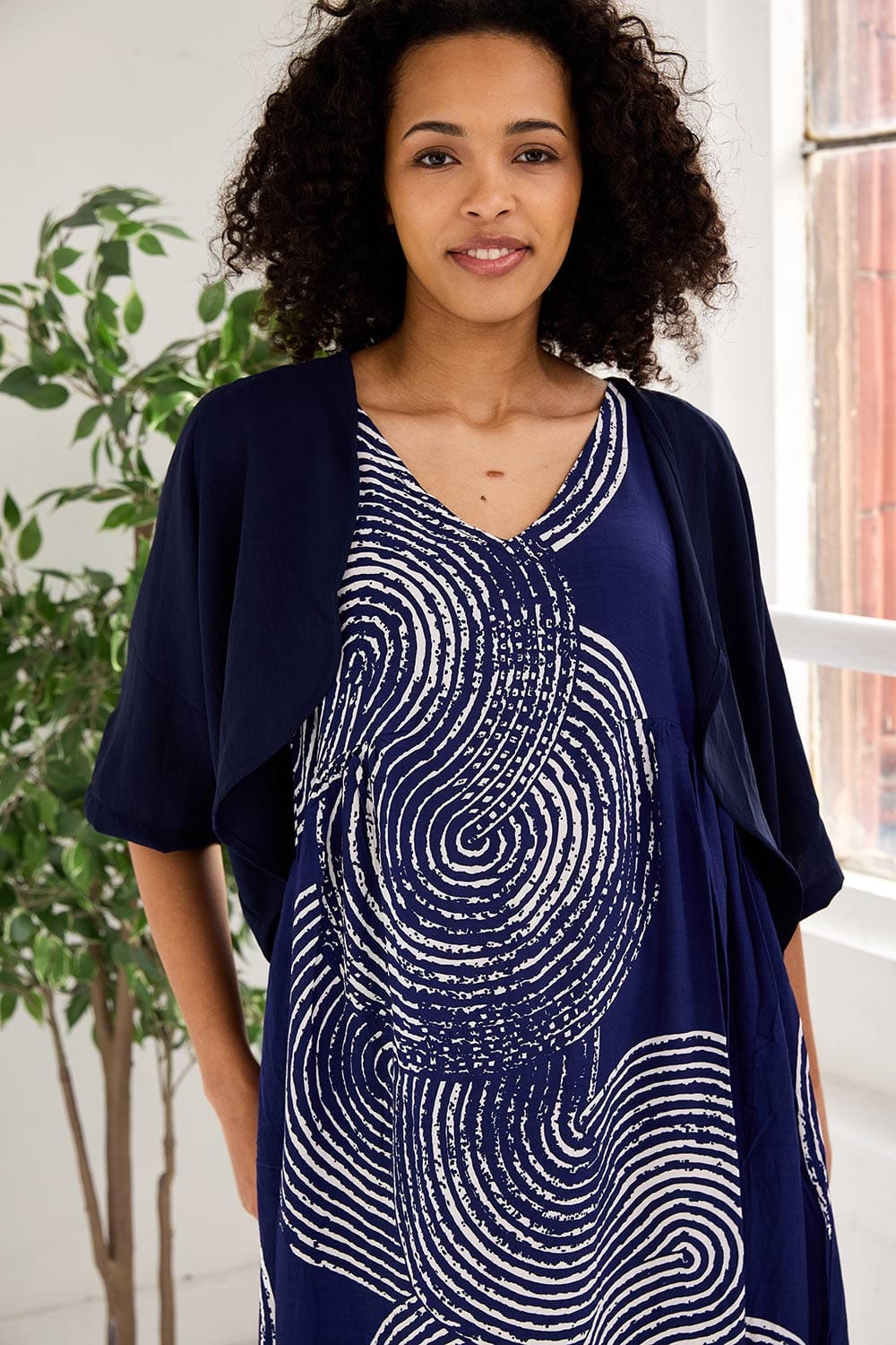 The Tara Vao summer dress features a circle pattern throughout, with a flattering v-neck neckline and sleeveless detailing, its the perfect summer dress.